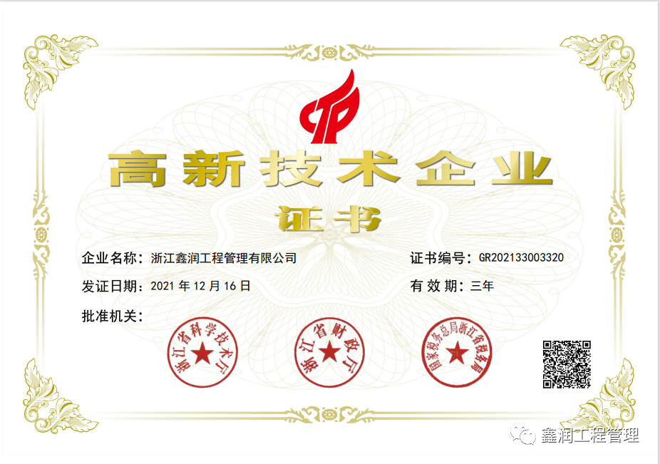 喜報|浙江鑫潤工程管理有限公司榮獲“高新技術企業”認證