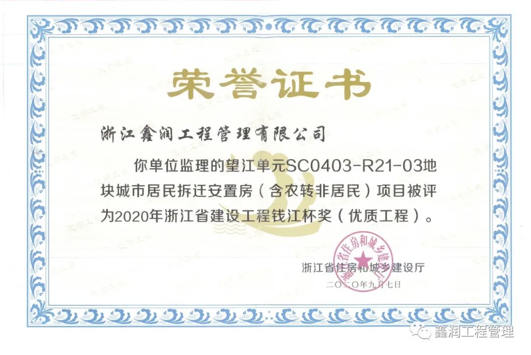 建筑工程質量不僅事關居民生活品質,還與城市的未來與傳承息息相關。近日,浙江省住房和城鄉建設廳頒發了2020年度浙江省建設工程錢江杯獎(優質工程)榮譽證書和獎牌。由浙江鑫潤工程管理有限公司監理的望江單元SC0403-R21-03地塊城市居民拆遷安置房(含農轉非居民)項目(以下簡稱“望江安置房”)獲此殊榮。